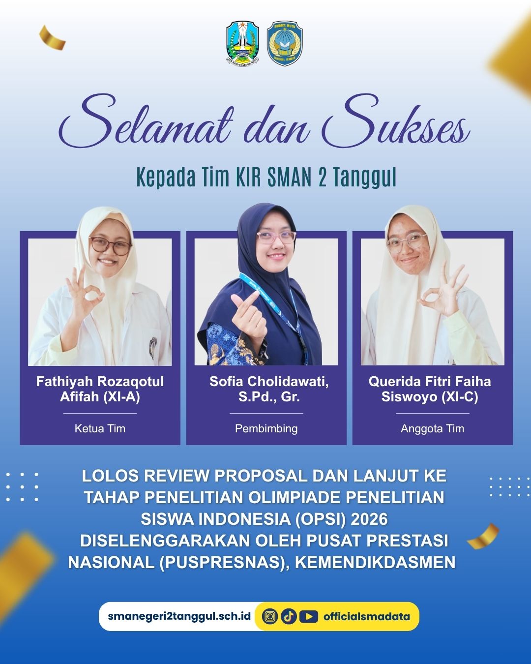 Tanggul – Kabar membanggakan datang dari SMAN 2 Tanggul. Tim Karya Ilmiah Remaja (KIR) sekolah tersebut berhasil lolos tahap review proposal dan melaju ke tahap penelitian dalam ajang Olimpiade Penelitian Siswa Indonesia (OPSI) 2026.