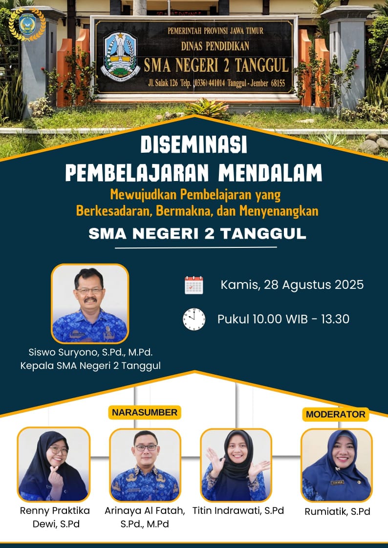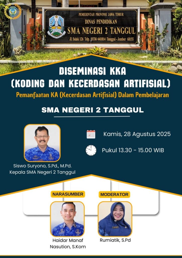 Tanggul, 28 Agustus 2025 – SMA Negeri 2 Tanggul terus menunjukkan komitmennya dalam meningkatkan kualitas pendidikan melalui berbagai inovasi pembelajaran. Pada Kamis, 28 Agustus 2025, sekolah ini menggelar dua agenda penting sekaligus, yakni Diseminasi KKA (Koding dan Kecerdasan Artifisial) dan Diseminasi Pembelajaran Mendalam.